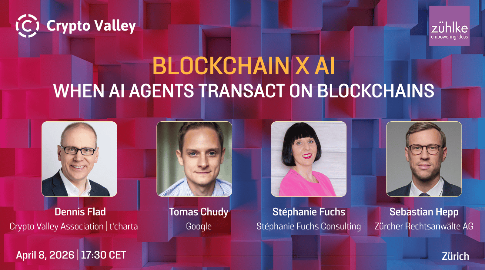 Dennis Flad, Partner at t’charta and Chair of the Enterprise Blockchain Working Group of the Crypto Valley Association. Dennis is a silverback and veteran in the payments industry and an early-bird in advising financial institutions and Fintechs how to adopt decentralized technology to empower new business models. Dennis will moderate the event and panel.