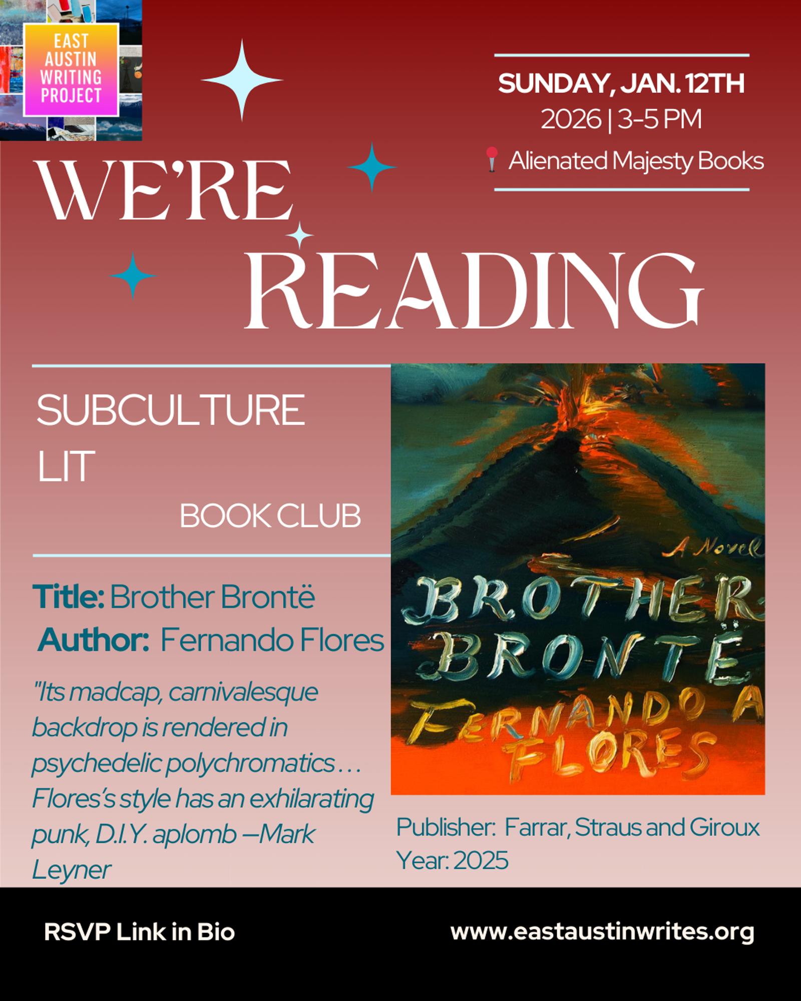 Subculture Lit is a book club with East Austin Writing Project. In January, we will be discussing the dystopian novel Brother Brönte by Fernando A. Flores at an in-person gathering in Austin, TX.